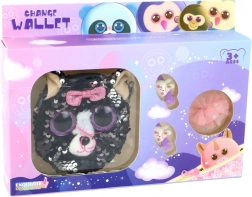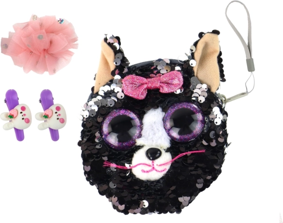 Zažite radosť vašej malej slečny s týmto krásnym setom, ktorý obsahuje niekoľko úžasných kúskov. Hlavným prvkom je peňaženka v tvare mačičky s fialovými očkami a ružovou mašľou. Perfektná nielen na uloženie malých pokladov, ale aj na každodenné používanie.