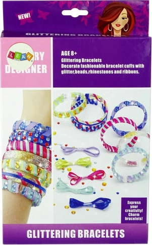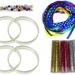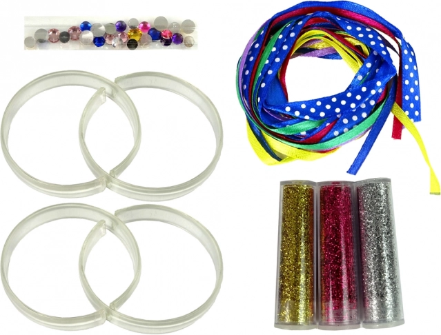 V balení nájdete: 4 priehľadné náramky, 3 trblietky (zlatá, strieborná, ružová) a stužky v rôznych farbách. Sada je uložená v ozdobnej krabici, takže sa skvele hodí ako darček. Odporúčané pre deti od 8 rokov. Obsahuje malé časti.
