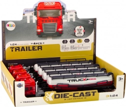 Realistický model nákladného auta s cisternou v mierke 1:24 poteší malých vodičov aj zberateľov. Ponúka svetelné a zvukové efekty po stlačení kabíny, odnímateľný príves a samostatný pohyb modelu pre ešte zábavnejšie hranie. Cisternový náves má rozmery 38 × 7 × 7 cm. Hračka je vhodná pre deti od 3 rokov a spĺňa normy CE a EN71. Cena je za 1 kus.