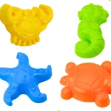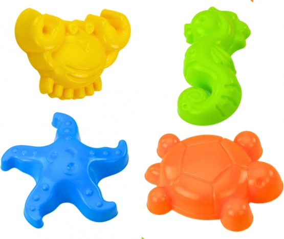 Obsahuje formičky v tvare kraba, morského koníka, hviezdice a korytnačky pre kreatívnu tvorbu v piesku.