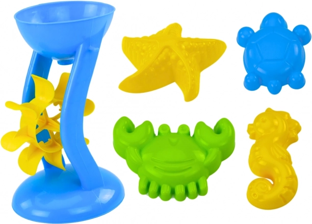 Sada obsahuje tiež mlynček, ktorý môže byť použitý na prelievanie piesku či vody. S pomocou lopatky a hrabličiek môžu malí stavitelia vytvárať zámky a tunely alebo hľadať skryté poklady. Štyri morské formičky v tvare koníka, hviezdice, kraba a korytnačky pridávajú na kreatívnosti a zábave.