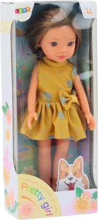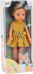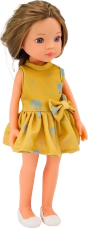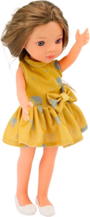 Sladká bábka o výške 33 cm je ideálna pre každodennú zábavu. Má jemný make-up, oblečená je v žltých šatách s vzorovanými slonmi a bielymi topánkami. Elegantná úprava vlasov povzbudí kreativitu detí.