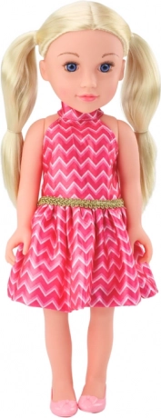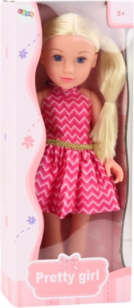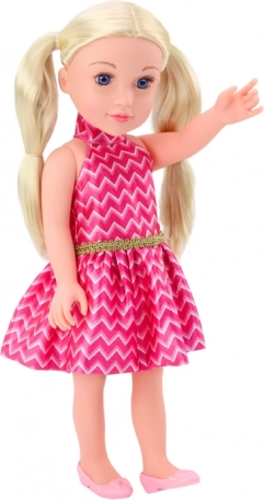 Táto krásna bábka má dlhé, blondavé vlasy upravené do copíkov, čo jej pridáva na detskom čare. Vlasy sú mäkké a ľahko štýlovateľné, čo umožňuje kreatívne kadernícke hry. Bábka má jemný make-up a dlhé riasy, ktoré zdôrazňujú jej výrazné rysy tváre. Je oblečená v ružových šatách so zlatým opaskom, kompletne zládnená s ružovými topánkami.
