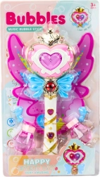 Stroj na mydlové bubliny v tvare paličky. Jeho telo z jemných pastelových odtieňov ružovej, fialovej a modrej vytvára harmonickú kompozíciu, ktorá okamžite upúta pozornosť. Zlaté detaily, vrátane zložito zdobených prvkov a trblietavého červeného kryštálu, mu dodávajú mimoriadny lesk a eleganciu.