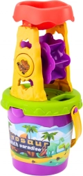 Všetko potrebné v jednom: vedro s mlynčekom, sitkom a lievikom, lopatka, hrable, kanvička a dve formičky pre nekonečnú zábavu na pláži aj v pieskovisku.