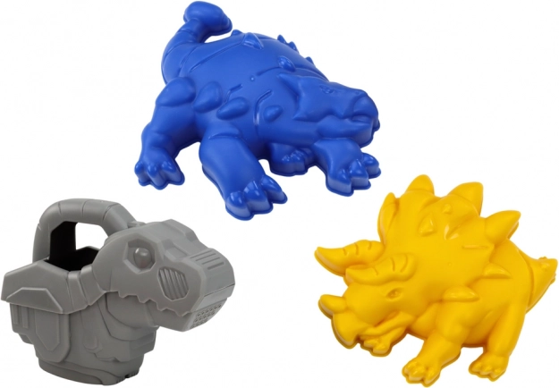 Kanvička s motívom dinosaura pozýva k vodným hrám a formičky (napr. triceratops) inšpirujú k tvorbe tematických pieskových svetov.