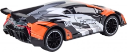 Sivooranžová športová karoséria so závodnými prvkami, nápismi a zadným krídlom dodáva modelu realistický vzhľad.