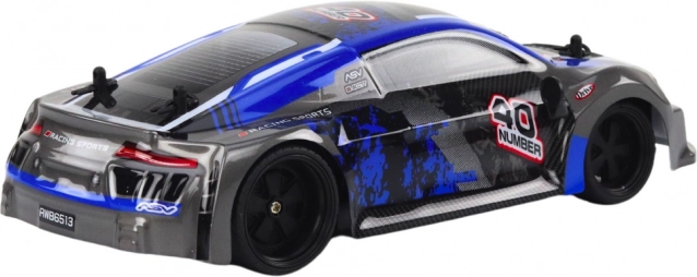Aerodynamická karoséria v modro‑čiernom prevedení s detailnými polepmi vyzerá skvelo a zároveň odolá nárazom pri jazde.