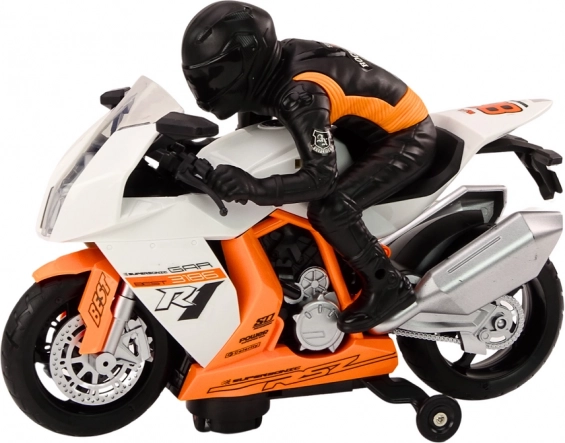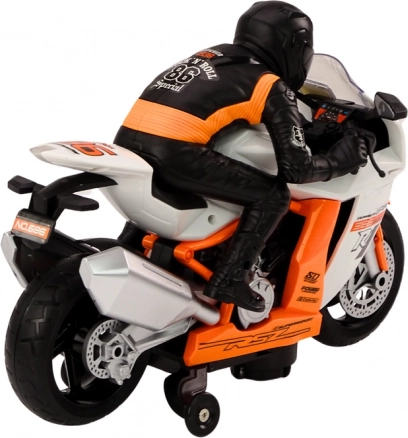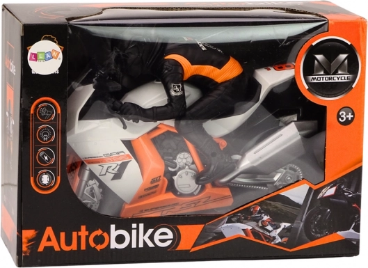Biely motocykel s jazdcom je dynamická hračka vyrobená z pevných materiálov, ktoré zaisťujú odolnosť a realistický vzhľad. Každý kus je starostlivo vyrobený s veľkým dôrazom na detail, čo dodáva motorke autentickosť a vďaka tomu vyzerá ako skutočná. Jej biela farba s oranžovými prvkami je pútavá a dodáva jej moderný a energický charakter. Na motorke je starostlivo reprodukovaná postava motocyklistu, ktorá jej dodáva realistický vzhľad.