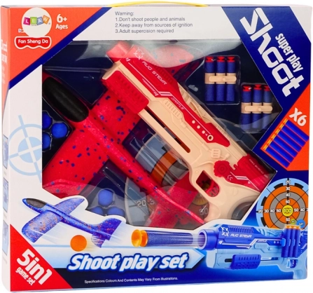 .Hračka 5 v 1, ktorá poskytuje množstvo zábavy a rôznych herných možností. Sada pozostáva z pištole, terča, šípov a penových loptičiek a tiež z lietadla. Vďaka svojej všestrannosti a inovatívnosti umožňuje táto sada mnoho kreatívnych foriem hry a zároveň rozvíja manuálne zručnosti a motorickú koordináciu dieťaťa.