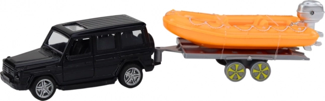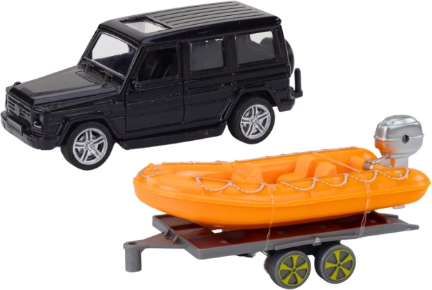 Čierne terénne auto s prívesom a oranžovým člnom