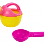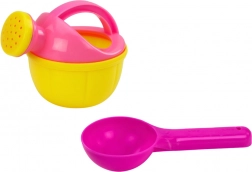 Farebná kanvička uľahčuje zvlhčovanie piesku a kompaktná lopatka skvele padne do detskej ruky na kopanie aj prenášanie.