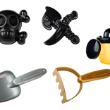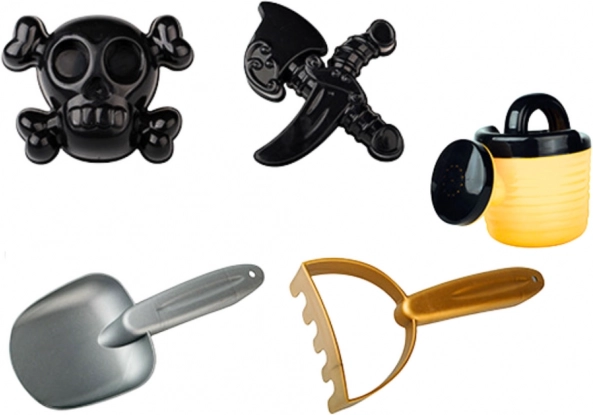 Všetko je ladené do pirátskej tematiky: formička v tvare lebky, zlaté hrabličky aj pevná sivá lopatka. Kanvička v bielo-červených farbách uľahčí spevnenie piesku vodou, takže sa vaše stavby len tak nezrútia. Sada podporuje jemnú motoriku, kreativitu a hru na role.