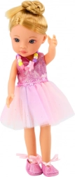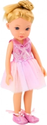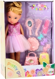 Bábika je oblečená do elegantných ružových baletných šiat, ktoré sa trblietajú a priťahujú pozornosť. Na nohách má klasické baletné topánočky uviazané okolo nohy, ktoré jej dodávajú autentický vzhľad skutočnej baletky. Bábika má dlhé blond vlasy upravené do vysokého drdola, ktorý podčiarkuje jej baletný štýl. Má jemné líčenie a farebný náhrdelník, ktoré jej dodávajú šarm a eleganciu. K bábike patrí štýlová kabelka, ktorá je ideálna na jej drobné doplnky. Funkčný kufrík, ktorý si bábika môže vziať na svoje baletné cesty. Sponky do vlasov, ktoré možno použiť na úpravu účesu bábiky. Malý prsteň, ktorý bábike dodá nádych elegancie. Zrkadielko, kefka a ručné zrkadlo, vďaka ktorým si bábika môže skontrolovať svoj vzhľad pred baletným vystúpením.