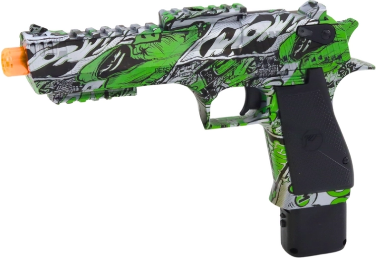 Pištoľ sa vyznačuje dynamickým farebným prevedením – je ladená v intenzívnej zelenej farbe, ktorá jej dodáva energiu a príťažlivosť. Okrem toho je zdobená striebornými prvkami, čo jej dodáva futuristický a moderný vzhľad. Navyše je celý dizajn ozdobený graffiti, čo mu dodáva mestský charakter a jedinečný štýl, ktorý upúta pozornosť a odlíši ju od ostatných hračiek.