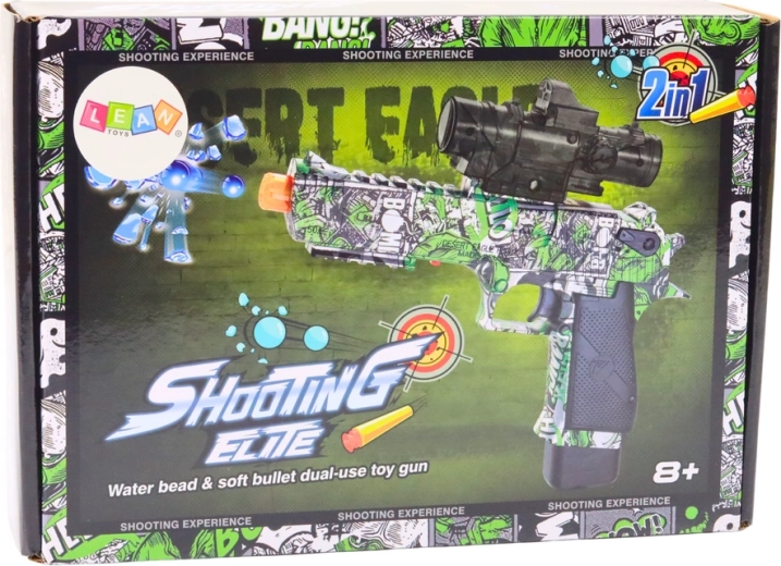 Pištoľ 2 v 1 ponúka neuveriteľnú univerzálnosť a umožňuje používateľovi strieľať ako vodné guličky, tak aj šípky s prísavkami. Vďaka tejto funkčnosti sa hranie nikdy neopozerá a používateľ môže ľahko prispôsobiť formu zábavy svojim aktuálnym potrebám a preferenciám. Pištoľ sa dodáva ako s vodnými guličkami, tak aj s dvoma šípkami s prísavkami. Tieto šípky sú ideálne na streľbu na terč a priľnú k hladkému povrchu, čo umožňuje rôzne zábavné a súťažné scenáre.