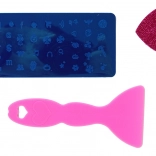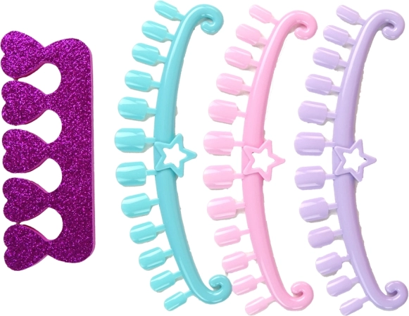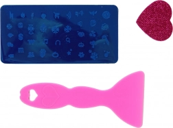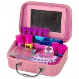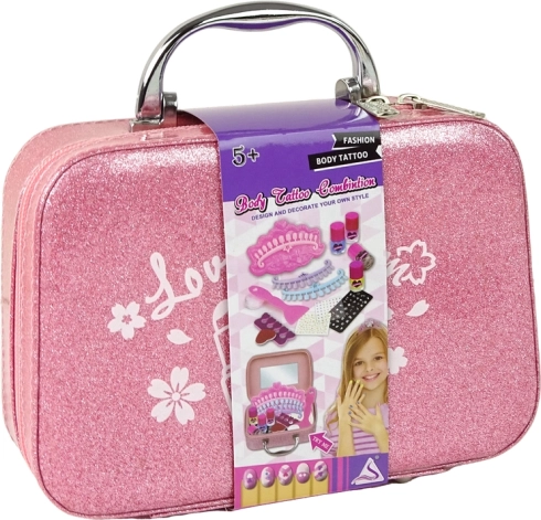 - Ružový trblietavý kufrík so zrkadielkom, 4 farebné laky na nechty, oddeľovač prstov, pilník, razítko, razítkovacia doštička so vzormi, škrabka/špachtľa, 3 šablóny na tipy, nálepky na tipy, samolepky a kamienky, malý kontajner