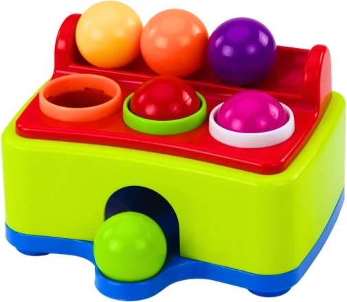 Interaktívny stôl na zatĺkanie guličiek je ideálna hračka pre predškolákov. Šesť farebných plastových guličiek sa vkladá do otvorov na hornej strane a deti ich pomocou kladivka zatĺkajú dovnútra. Guličky následne vyjdú predným tunelom, čo prináša prekvapenie a podporuje opakovanú hru.