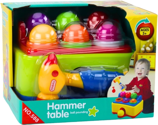 Balenie obsahuje stôl s otvormi, 6 farebných guličiek a zvukové kladivko. Ideálne ako darček, spĺňa normy CE a EN71.