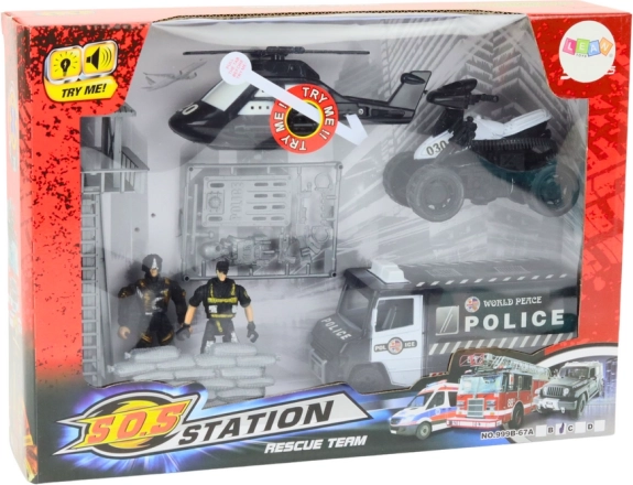 - Helikoptéra so svetlami a zvukmi, policajné vozidlo, štvorkolka, motorka, 2 figúrky, strážna veža, závora, doplnky POLICE