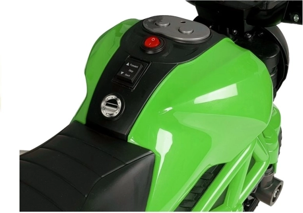 Ovládanie je jednoduché: na nádrži nájdete hlavný vypínač a prepínač smeru jazdy (vpred, vzad, neutrál). LED svetlomet na predku vie svietiť v niekoľkých farbách, čo dodáva jazde atraktívny efekt. Motorka je vhodná pre deti od 3 rokov, bez diaľkového ovládania pre rodičov, a spĺňa európske normy s certifikáciou CE.