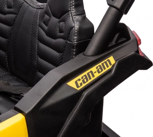 Čierne sedadlo s čalúnením a značkou Can-Am poskytuje pohodlie a bezpečnosť, ktoré deti pri jazde potrebujú.