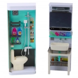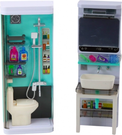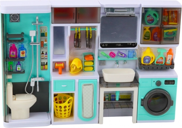 Tento premyslený set sa skladá zo 4 prepojených segmentov: sprchového kúta s toaletou, umývadla so zrkadlom, práčky so skrinkou a políc so žehliacou doskou. Tyrkysovo-biely dizajn a precízne spracovanie podporujú predstavivosť a motivujú deti k napodobňovaniu bežných činností. Rozmery zostavy 35 × 26 × 8 cm skvelo sadnú do detskej izbičky aj k domčeku pre bábiky.