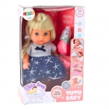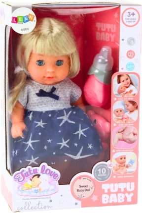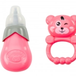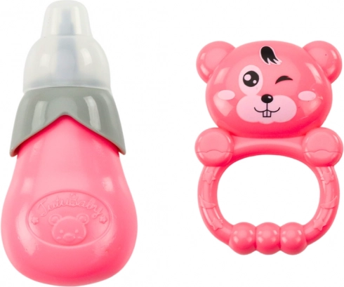 Súčasťou setu je kojenecká fľaša, ktorá po naplnení vodou umožňuje "močenie" bábiky. Hrkálka podporuje motorický rozvoj a koordináciu.