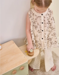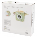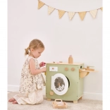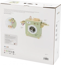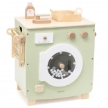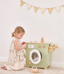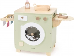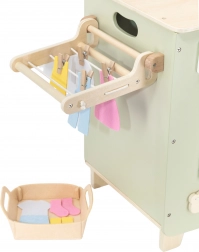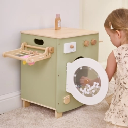 Táto kvalitná drevená práčka v jemnej pastelovo zelenej farbe s prírodnými akcentmi prináša deťom autentický zážitok z prania, sušenia aj žehlenia. Ovládacie gombíky, priehľadné dvierka a bočný skladací sušiak s kolíčkami zabezpečujú dlhé hodiny zmysluplnej hry a rozvoja zručností.