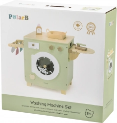 Štýlová drevená práčka so sadou doplnkov od značky VIGA z kolekcie POLARB je perfektná hračka pre rolové hry detí od 3 rokov. Ponúka realistické ovládacie prvky, otváracie dvierka, výsuvný sušiaci rošt s kolíčkami a žehliacu dosku so žehličkou. Podporuje jemnú motoriku, kreativitu a učenie sa základným domácim činnostiam formou hry.