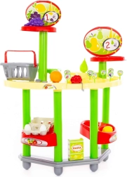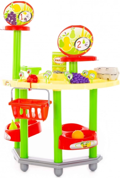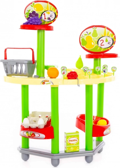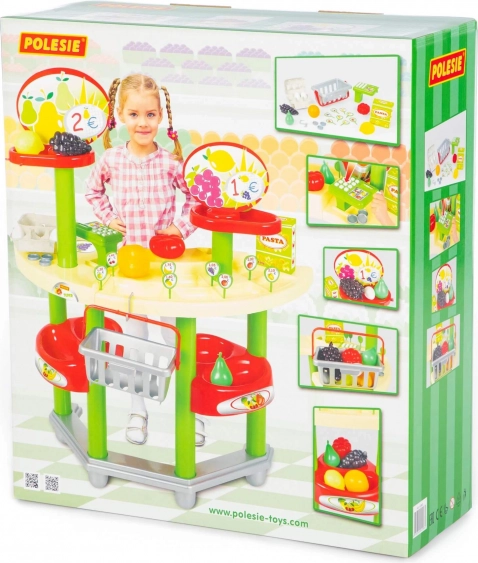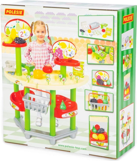 Súčasťou sú rôzne druhy tovaru, ovocia a ďalšie doplnky, ktoré deti ukladajú do košíka a na police. Vďaka výrazným farbám je triedenie a výber zábavný a prehľadný.