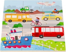 Vďaka pevnému drevu a hladkým hranám je hra bezpečná od 18 mesiacov. Veselé farby a jasné tvary zaujmú a pomôžu lepšie spoznať autá, autobusy, lode, lietadlá a ďalšie dopravné prostriedky. Po dokončení môže dieťa vozidlá pomenovať a hľadať ich na veľkom obrázku – skvelá aktivita na rozvoj reči.