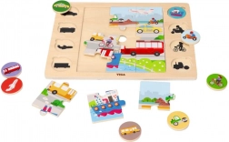Objavte zábavnú a vzdelávaciu hru pre najmenších: drevené puzzle VIGA s motívom dopravných prostriedkov. Deti najprv poskladajú stredovú skladačku a potom priraďujú okrúhle dieliky k obrysom na doske. Hra rozvíja jemnú motoriku, koordináciu ruka–oko, logické myslenie aj slovnú zásobu a je vyrobená z bezpečných drevených materiálov s farebnými ilustráciami.