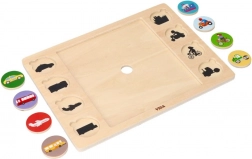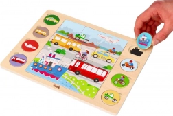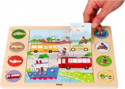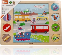 Drevená sada puzzle VIGA „Nájdi a priraď – dopravné prostriedky“ kombinuje radosť z hry s múdrym učením. Uprostred poskladáte 9 veľkých dielikov do obrázku a následne dieťa priraďuje 8 okrúhlych žetónov s vozidlami k ich siluetám na doske. Podporuje prirodzené učenie formou hry a posilňuje sebavedomie dieťaťa pri každom správnom priradení.