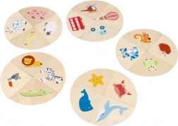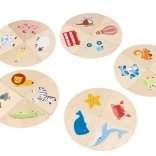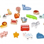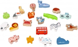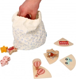 Odolné drevené tvary so zvieratkami, vozidlami a predmetmi motivujú k učeniu aj voľnej hre. Hladké hrany sú bezpečné pre malé ruky.