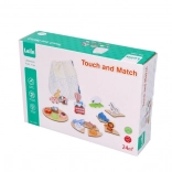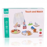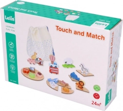Táto drevená hra typu „Touch & Match“ od značky LELIN učí deti rozpoznávať tvary a obrázky pomocou hmatu. Farebné drevené dieliky s motívmi zvierat, dopravných prostriedkov a predmetov sa párujú s príslušnými podložkami, zatiaľ čo dieťa hľadá správny dielik poslepiačky v látkovom vrecúšku.
