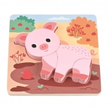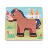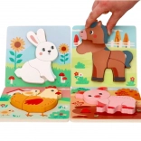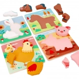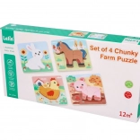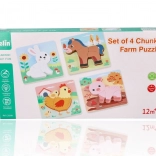 Objavte hravé učenie s touto sadou štyroch drevených skladačiek s motívmi z farmy – zajačik, kôň, kuriatko a prasiatko. Každá skladačka má pevné, „chunky“ dieliky ideálne pre malé detské ruky a farebné podložky, ktoré podporujú rozpoznávanie tvarov a zvierat.