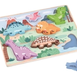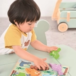 Hrubšie „chunky“ dieliky dinosaurov sa ľahko uchopujú, dobre držia v ruke a bezpečne sa vkladajú do podložky – ideálne pre prvé puzzle.