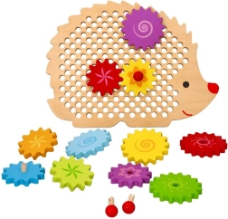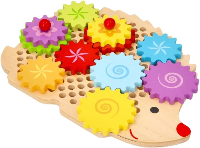 Drevená skladačka v tvare ježka s pestrými ozubenými kolieskami podporuje rané učenie hrou. Deti môžu umiestňovať kolieska na kolíky, skúšať rôzne kombinácie a sledovať, ako sa všetky kolá roztočia. To posilňuje logické myslenie a prirodzene vysvetľuje princípy príčiny a následku.