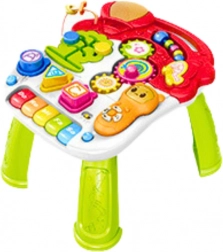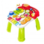 Vzdelávací stolík je vybavený interaktívnym panelom s rôznymi tlačidlami a senzormi na zábavnú a edukačnú hru.