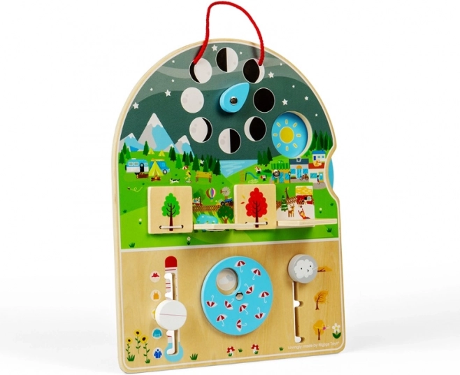 Táto interaktívna drevená doska je ideálnym nástrojom pre deti, ktoré sa zaujímajú o prírodu a chcú lepšie pochopiť, čo sa deje v našom svete. Vyrobená z kvalitného a zodpovedne získaného dreva, doska poskytuje rôzne výukové prvky, ktoré zobrazujú rôzne meteorologické podmienky: slnečno, oblačno, dážď, sneh a vietor.