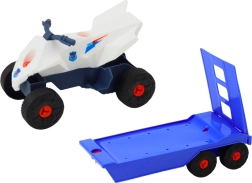Modré vozidlo s prívesom na prevoz quadu prináša autentický policajný vzhľad a plynulú jazdu po rôznych povrchoch.