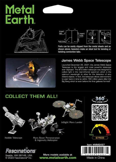 Súprava na vytvorenie fascinujúceho kovového 3D modelu. Stavba puzzle METAL EARTH vyžaduje trpezlivosť a šikovné ruky. Výsledok práce však plne vyváži vynaložené úsilie. Miniatúrne repliky sú pôsobivou a pútavou dekoráciou. Zo štvorcových plátkov ocele vám pod rukami vyrastú detailne prepracované, fascinujúce modely. Autentický vzhľad 3D puzzle METAL EARTH je dosiahnutý vďaka detailnému laserovému gravírovaniu. Náradie nie je súčasťou balenia. PRACOVNÝ POSTUP: Jednotlivé diely vyberte z kovových plátkov, v prípade potreby použite malé štípacie nožnice (nie sú súčasťou). Dieliky sa spájajú pomocou zámkov tvorených úchytom (jazýčkom) a otvorom. Jazýček ohnite pomocou malých tenkých klieští (nie sú súčasťou) a postupne spojte všetky zámky, až vznikne veľmi realistické majstrovské dielo!