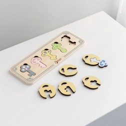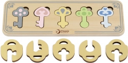 Táto zmyslová montessori vkladačka prináša deťom od 18 mesiacov zábavný spôsob, ako trénovať logiku a trpezlivosť. Každý z 5 kľúčov má vlastný tvar aj farbu a dieťa ho zasúva do zodpovedajúceho „zámku“. Doska zároveň ponúka praktické uloženie všetkých kľúčov, takže je hra vždy prehľadná.