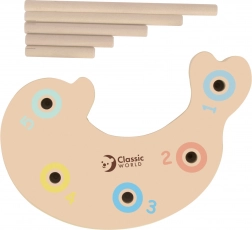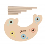 Táto drevená sada prináša deťom od cca 3 rokov pestrú porciu učenia hrou. Vďaka magnetickým prútom si deti precvičia presnosť a trpezlivosť, balančná časť hry rozvíja rovnováhu a zručnosť a triediaca doska s číslami pomáha s rozpoznávaním farieb a počtov.