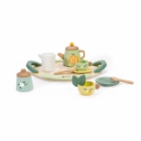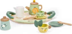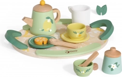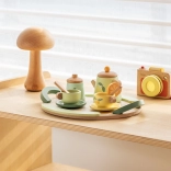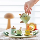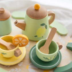 Doprajte deťom kúzelný čajový obrad s elegantnou drevenou sadou v jemných pastelových odtieňoch. Set je zdobený ovocnými a kvetinovými motívmi a obsahuje kanvičku, šálky s podšálkami, lyžičky, dózy na mlieko a cukor aj veľkú tácku s úchytmi na ľahké prenášanie.