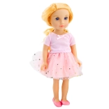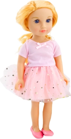 Nádherné šaty s tylovou sukňou, zdobené zlatými hviezdami, dodávajú bábike rozprávkový vzhľad, pripravený na akúkoľvek špeciálnu príležitosť. Detaily a vysoko kvalitné materiály zaisťujú príjemný dotyk a ľahkú manipuláciu, čo uľahčuje hru a rozvoj detskej koordinácie.