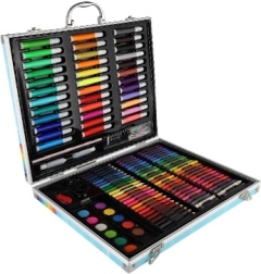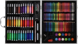 150 kusov rôznych umeleckých pomôcok vrátane fixiek, farebných ceruziek a farieb, ktoré sú starostlivo usporiadané pre ľahký prístup k tvorbe.