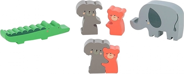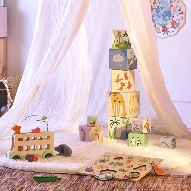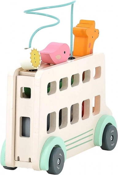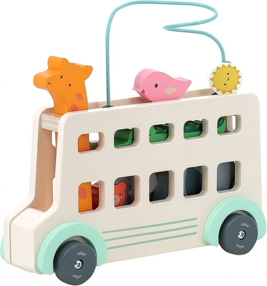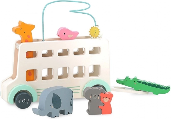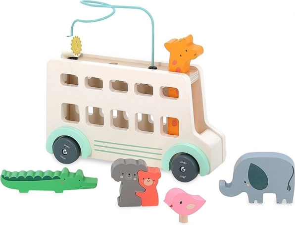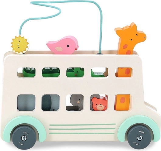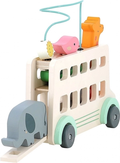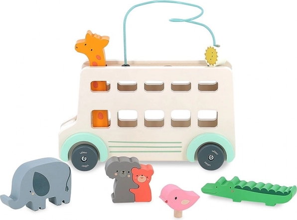 Drevený autobus ponúka mnoho interaktívnych prvkov ako vyrezávané okienka, farebné zvieracie postavičky a korálkový labyrint na streche, ktoré podporujú kreativitu.