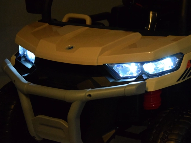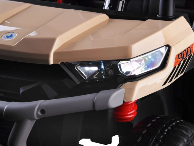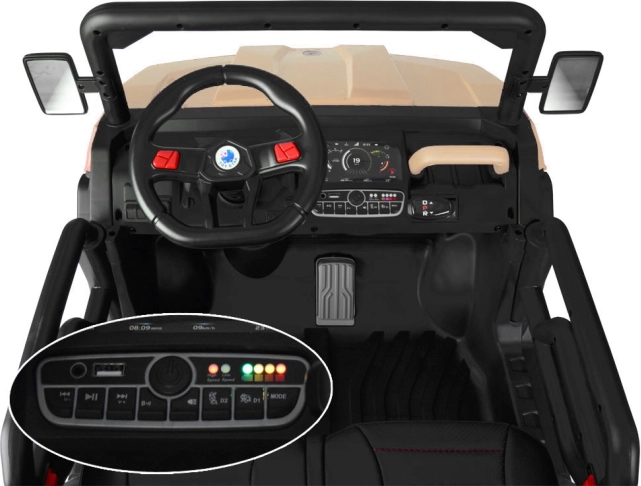 Mäkké EVA kolesá, odpruženie, dvojité sedadlo z eko kože a 1-bodové pásy. Rodič má istotu vďaka diaľkovému ovládaniu 2,4 GHz s funkciou brzdy.